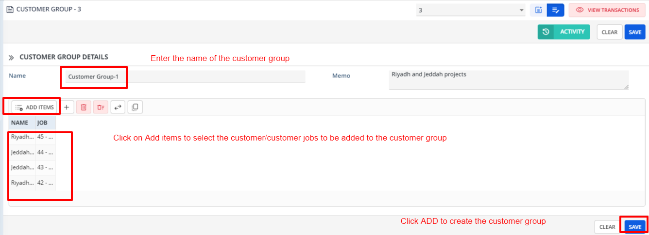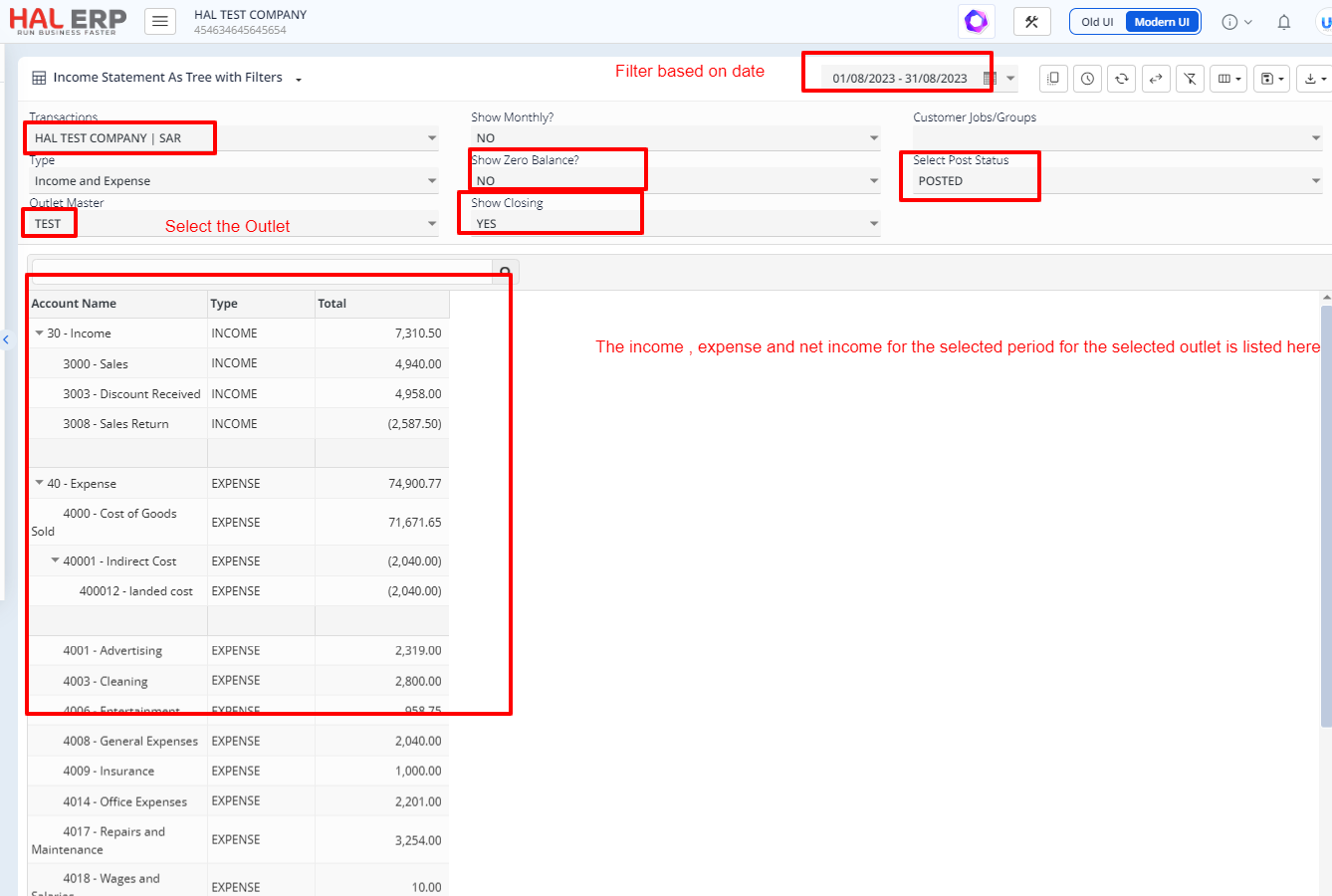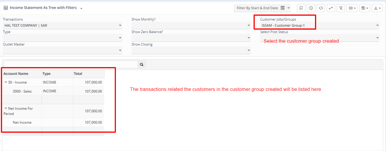 Once the customer group is created, the same can be selected to generate income statement for the created customer group