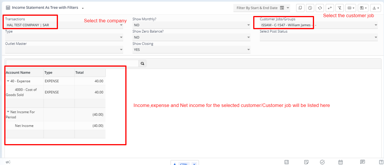 2. Income statement filtered based on a customer or a customer Job/Project