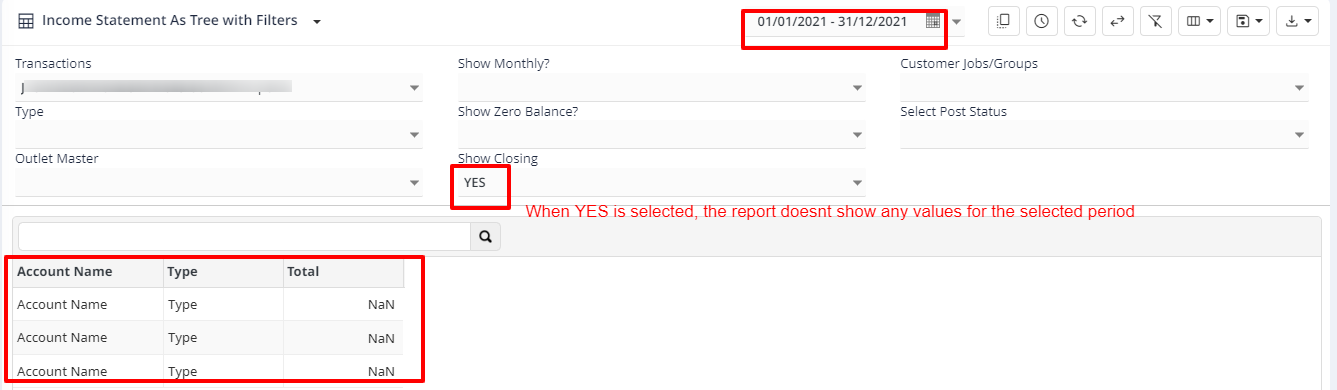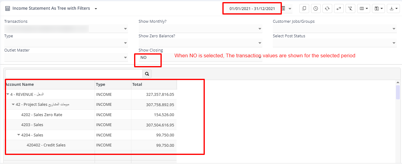 When a particular financial period is closed, all the income expense entries of the year is reversed and would become zero. To view the Income statement report of the financial period that is closed , this report has a filter option called "Show closing" which when set to NO would show the income expense transactions of the closed financial period.