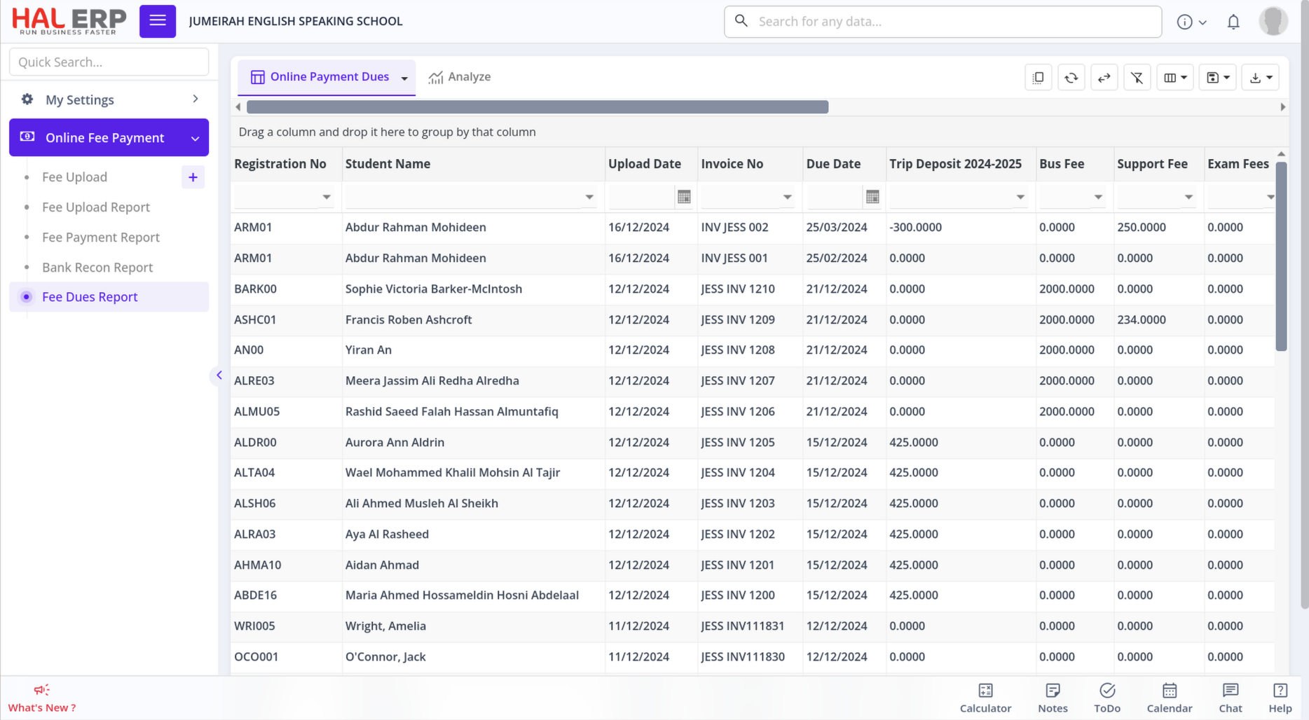 The Fee Dues Report page is designed to help track outstanding fees and distinguish them from the amounts that have already been paid. This page provides a module-specific breakdown for each invoice and student, showing the outstanding fees for each module that the parent has yet to pay. By offering this detailed view, users can easily identify any pending payments and their corresponding invoices.